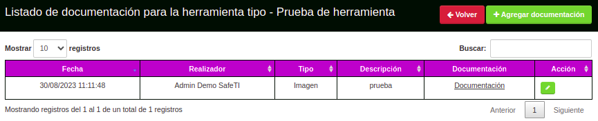 Luego de ingresar los datos debe hacer clic en el botón “Guardar”, esto lo devolverá al listado de tipos de herramientas, podrá “Editar” el nombre y la descripción del tipo también verá el nuevo tipo ingresado, ahora podrá agregarle “Documentación”, con los botones de la columna “Acción”: