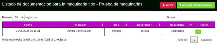 Luego de ingresar los datos debe hacer clic en el botón “Guardar”, esto lo devolverá al listado de tipos de maquinarias, aquí verá el nuevo tipo ingresado, ahora podrá agregarle “Documentación”, con los botones de la columna “Acción”, también podrá “Editar” el nombre y la descripción del tipo: