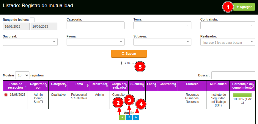 - Agregar: Para ingresar un nuevo registro de mutualidad.