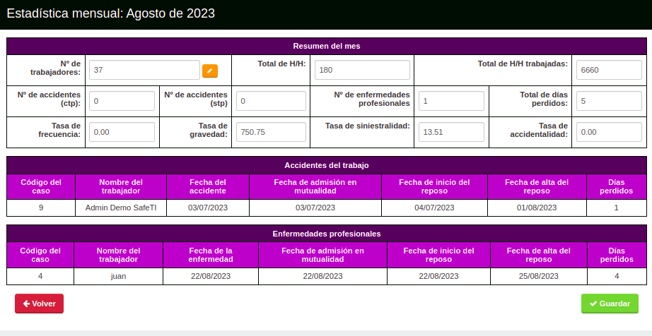 - Nueva: Para ingresar una nueva estadística debe haber alguna investigación sea de accidentes/enfermedades profesionales en el mes que sigue del listado.