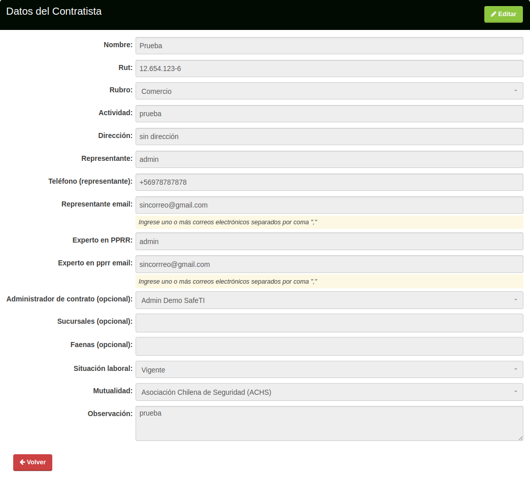El sistema mostrará una tabla con todos los contratistas de la empresa registrados: