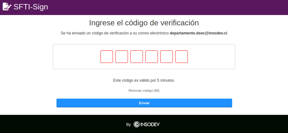 Deberá volver a ingresar un código que se encuentra ya en su bandeja de correos. Luego de ingresar el código podrá visualizar el documento ya firmado presionando el botón de "Documentos firmados".