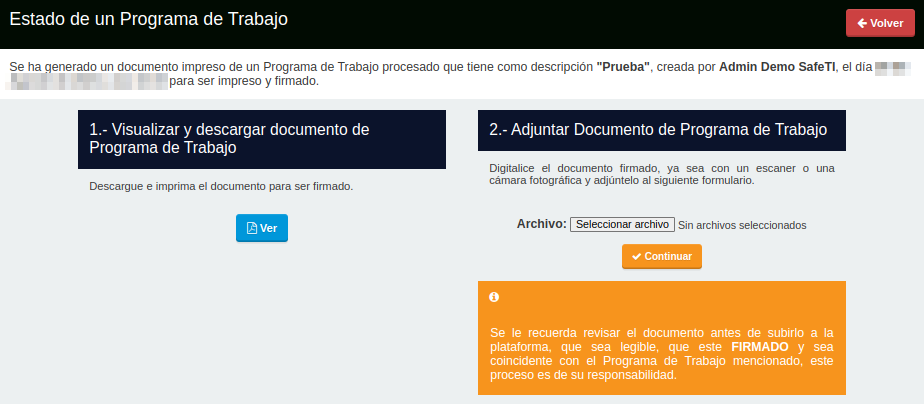 Al presionar el botón "Ver Estado" se cargará una nueva pestaña donde podrá descargar el documento para ser firmado y posteriormente adjuntar el documento ya firmado: