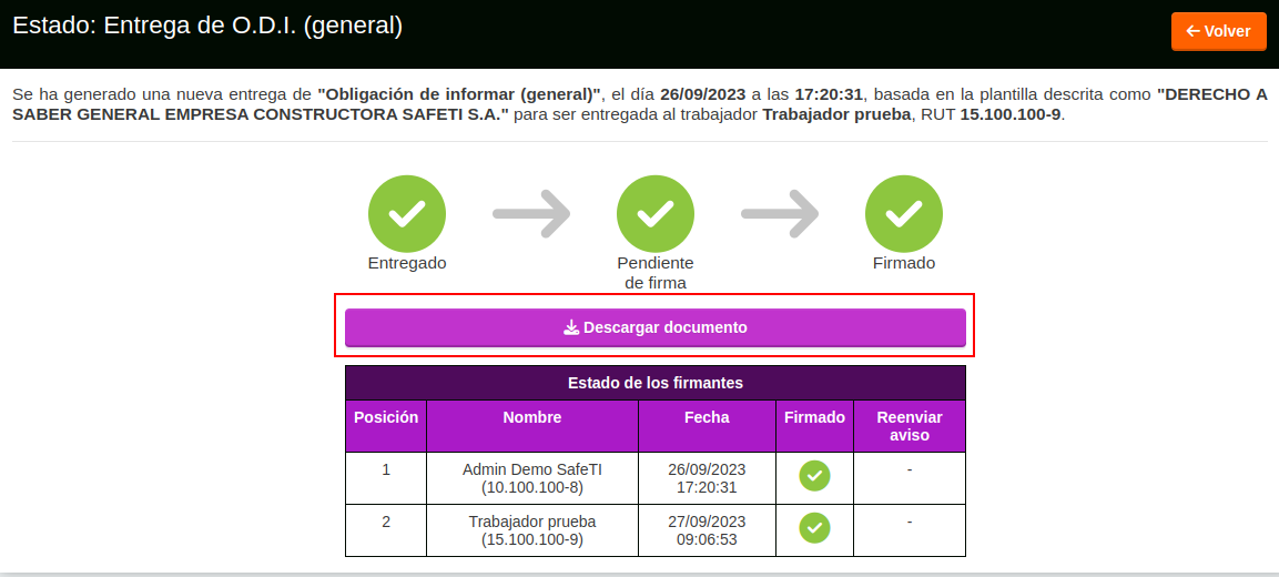 Podrá descargar el documento ya firmado presionando el siguiente botón que este lo dirigirá al estado de la entrega donde deberá hacer clic en "Descargar documento":