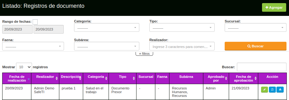 Deberá completar el formulario con los datos requeridos y al finalizar presione Continuar, El sistema cargara el listado de registros de documentos: